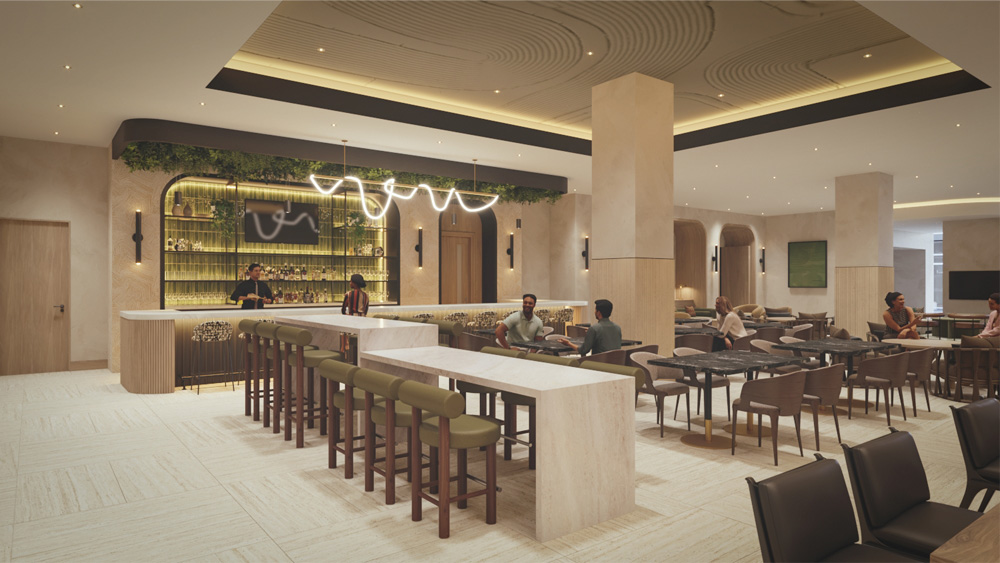 - New bar, market and reception millwork with integrated stone, metals and lighting